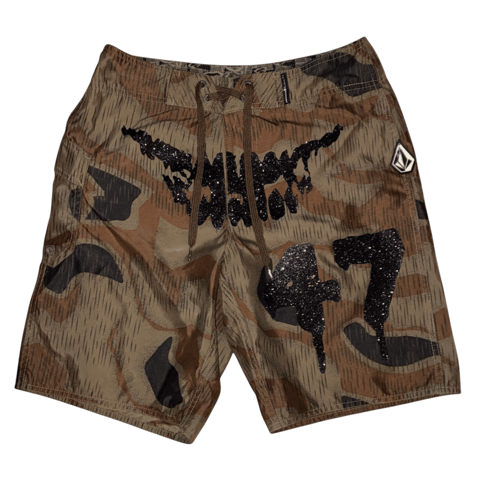 1/1 size 30 camo volcom shorts that i printed over with a bunch of black sparkly hc graphics.