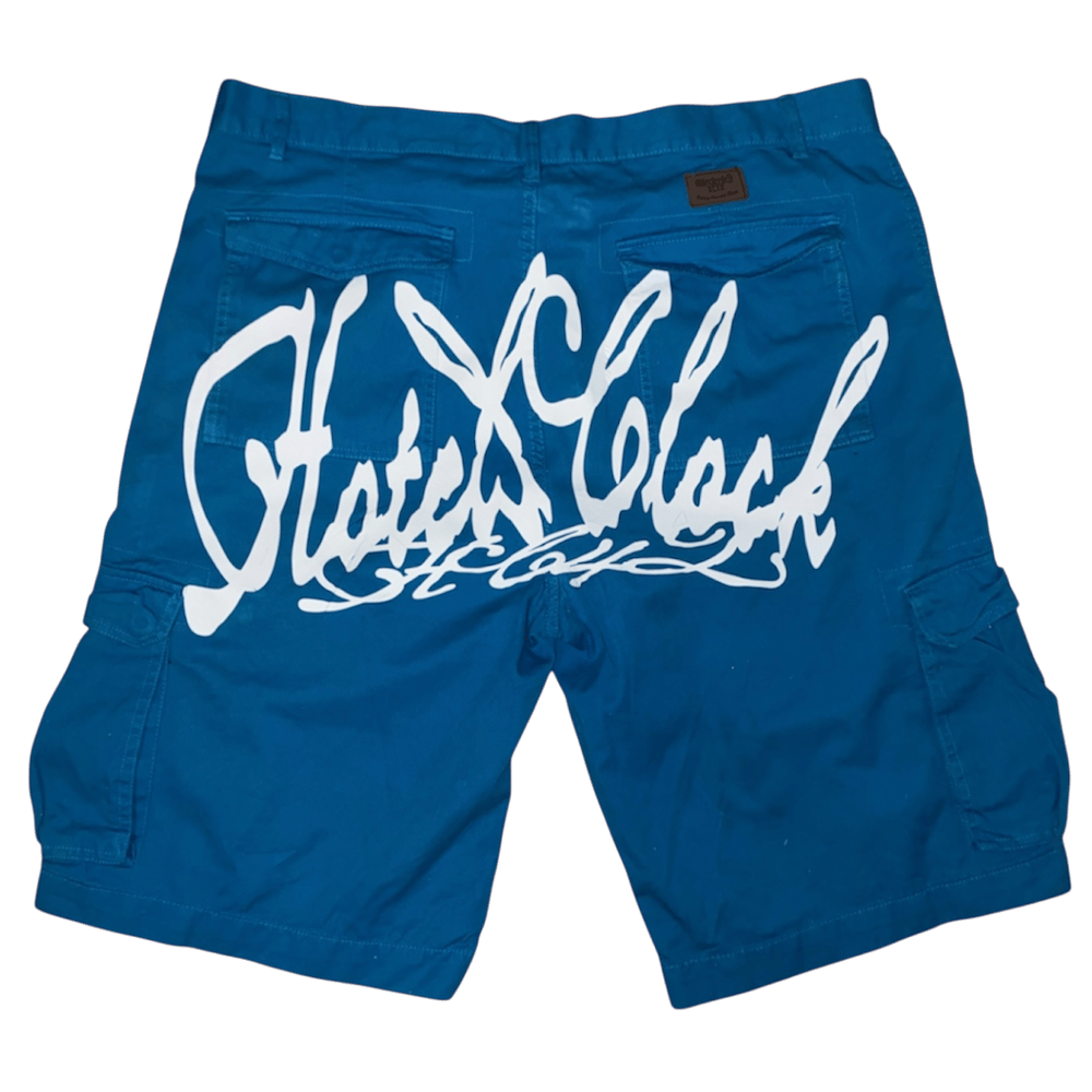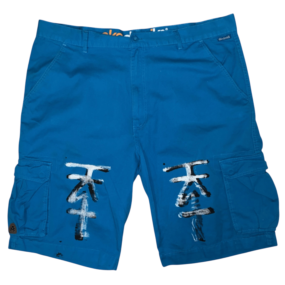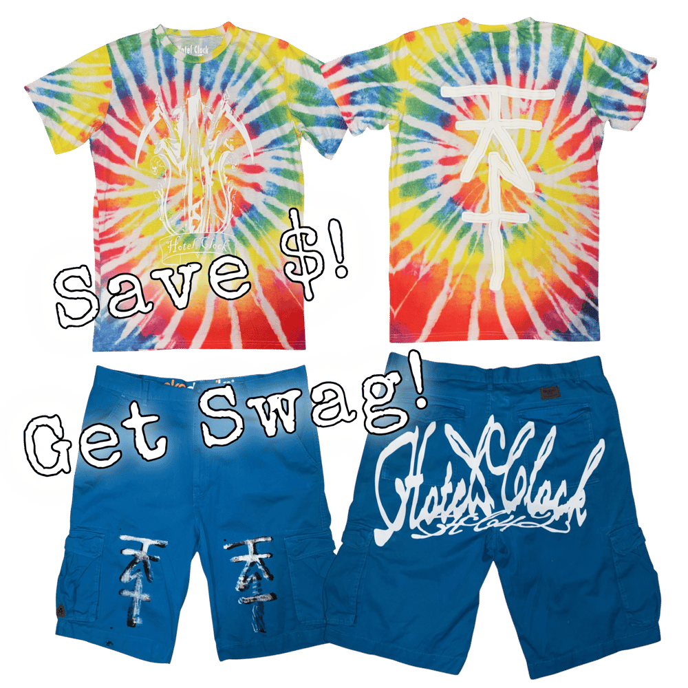 this Listing is for the Baggy sz 46 blue Shorts (1/1) and sz XL rainbow tie Dye reaper Tee (1/1) bundle Package!